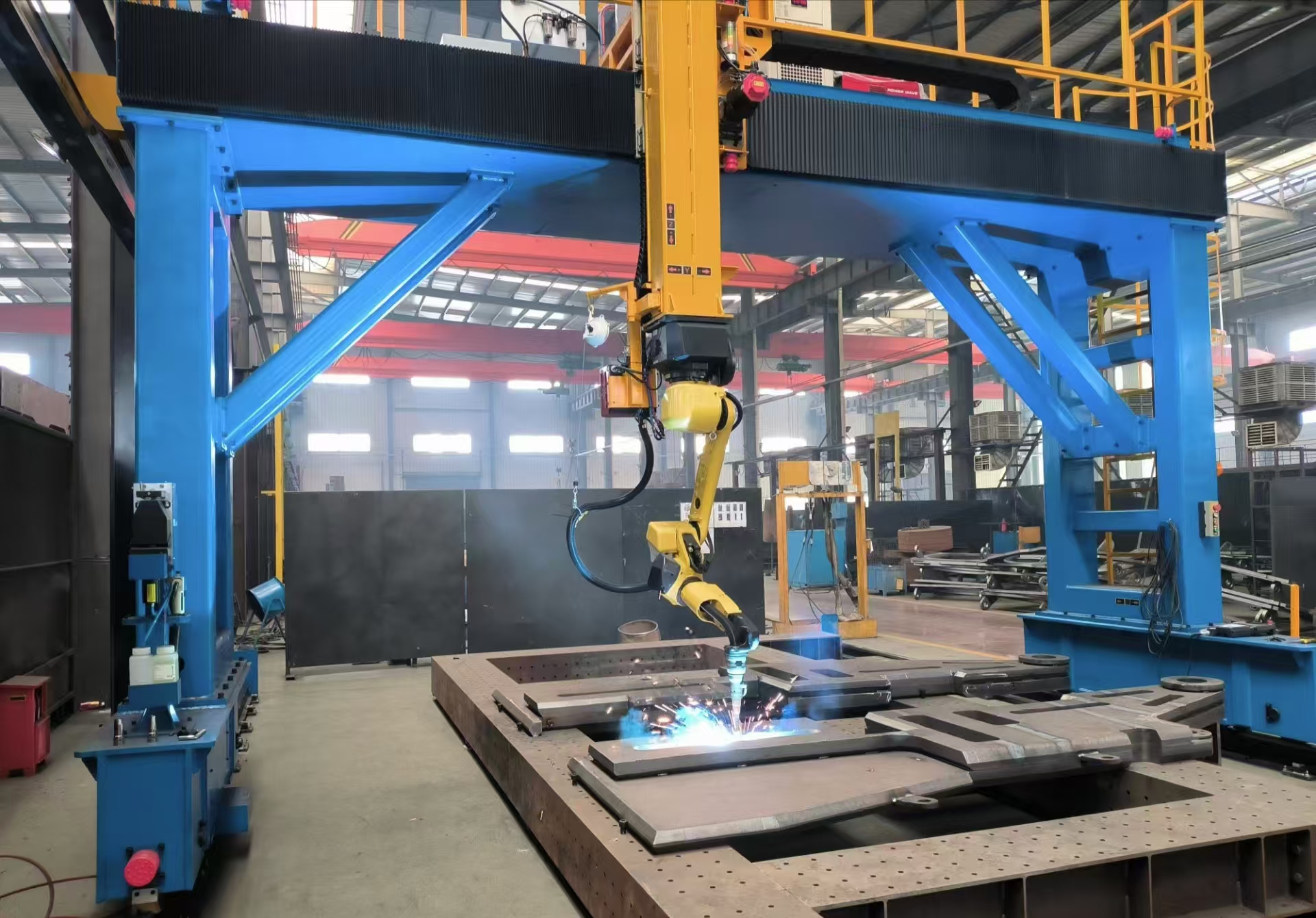 通過六軸機(jī)器人、三軸龍門行走機(jī)構(gòu)以及兩軸 L 型變位機(jī)配合使用,使得該機(jī)器人工作系統(tǒng)有較大的工作范圍和良好的系統(tǒng)柔性,即使大型復(fù)雜工件上可達(dá)性不好的空間焊縫,也可輕松勝任!